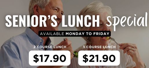 Seniors can enjoy a 2 or 3 course lunch including a complimentary house wine, soft drink or coffee!
