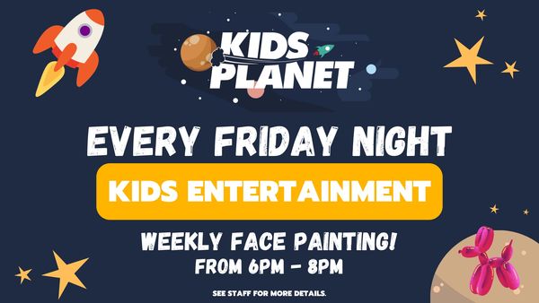 Every Friday night, treat your kids to our FREE kids entertainment at Kid's Planet! Enjoy weekly face painting from 6-8pm.