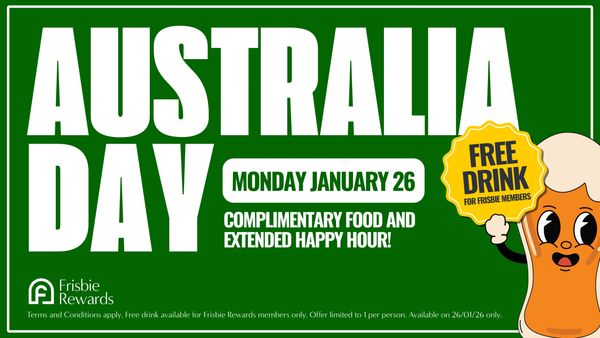 Join us for happy hour and complimentary finger food from 12-3pm this Australia Day. PLUS, Frisbie Rewards members get a FREE drink!